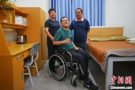 來自江蘇啟東的董亦超前來東南大學(xué)報到,坐在輪椅上的他在父母的陪同下入住宿舍。泱波 攝