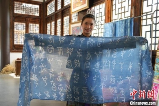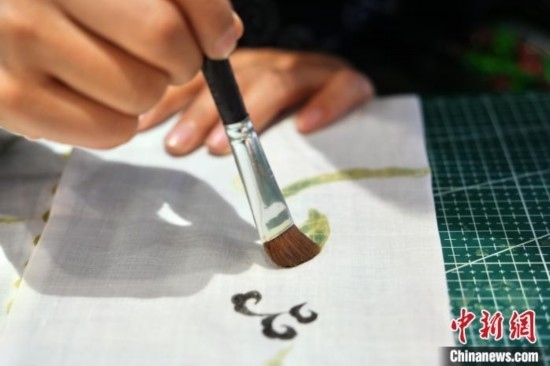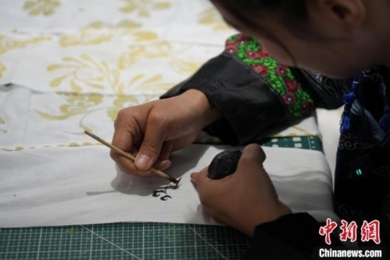 貴州織金苗族蠟染2021年6月入選國(guó)務(wù)院公布第五批國(guó)家級(jí)非物質(zhì)文化遺產(chǎn)代表性項(xiàng)目名錄。“95后”苗族女孩王秋雨大學(xué)畢業(yè)后回到織金,成為一名織金苗族蠟染推廣者。她不僅使用傳統(tǒng)小臘刀,還使用大臘刀和毛筆,以蜂蠟為墨在絲巾、衣服、箱包上繪制小篆、甲骨文、山水等文字與圖案,這些蠟染產(chǎn)品深受消費(fèi)者喜愛(ài)。圖為6月19日,王秋雨在織金縣平遠(yuǎn)古鎮(zhèn)的依文織金數(shù)字化展廳制作蠟染。周燕玲 攝