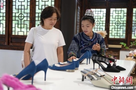 6月19日,王秋雨向游客介紹有蠟染元素的女鞋。周燕玲 攝