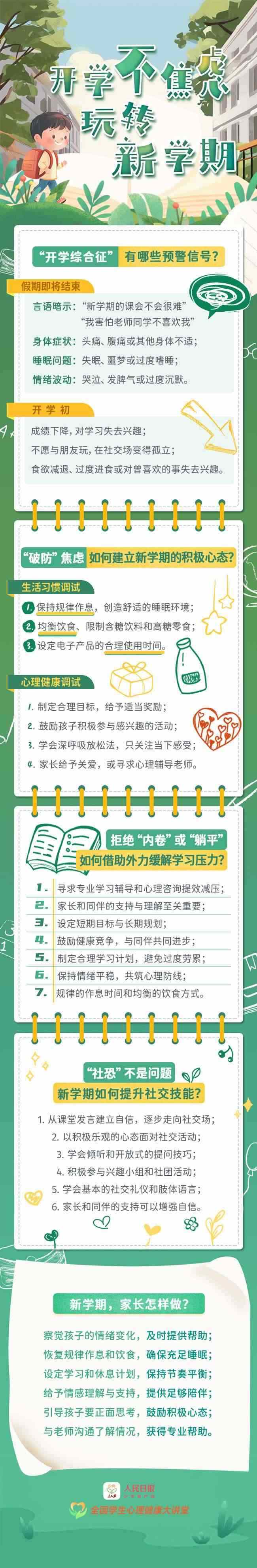 進(jìn)入開學(xué)倒計(jì)時(shí),孩子出現(xiàn)情緒低落、身體不適,還常把“不想上學(xué)”掛在嘴邊……這些都是“開學(xué)綜合征”的預(yù)警信號(hào)。面對(duì)新學(xué)期的挑戰(zhàn),孩子如何調(diào)整心態(tài)?家長(zhǎng)如何應(yīng)對(duì)?心理健康專家來(lái)支招,帶你玩轉(zhuǎn)新學(xué)期。