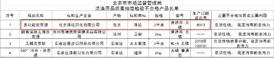 公告顯示,北京市市場(chǎng)監(jiān)督管理局2020年6月24日公示的洗滌用品質(zhì)量抽檢信息中,標(biāo)稱生產(chǎn)企業(yè)“北京市洛娃日化有限公司”,標(biāo)稱商標(biāo)“洛娃”,規(guī)格“2千克”,型號(hào)“普通型無(wú)磷”,生產(chǎn)日期或批號(hào)“B013”的多功能洗衣液,不合格項(xiàng)目“總活性物,規(guī)定污布的去污力”。該產(chǎn)品被抽檢場(chǎng)所為“密云縣密云鎮(zhèn)億源來(lái)商店”,現(xiàn)“北京市洛娃日化有限公司”聲稱該產(chǎn)品為假冒其注冊(cè)商標(biāo)及廠名、廠址的產(chǎn)品。