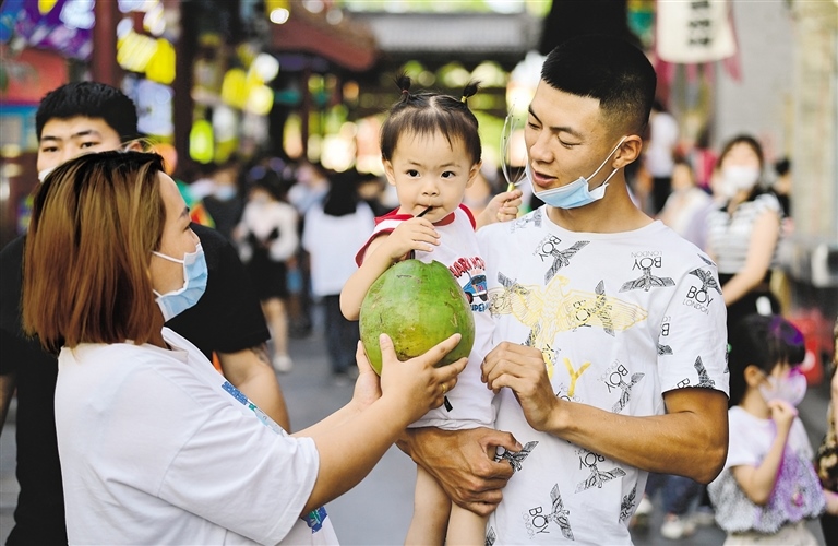 6月18日,呼和浩特市民在玉泉區(qū)通順大巷小吃街上品嘗椰子汁。當(dāng)日,2022年塞上老街音樂美食季在呼和浩特市玉泉區(qū)開幕。今年的音樂美食季活動共分為阿拉坦汗廣場、大召前街等六大活動區(qū)塊,推出啤酒節(jié)、美食季、快閃店、后備箱集市等八大主題活動,助力首府夜經(jīng)濟發(fā)展、夜消費繁榮,活動將持續(xù)到9月底。(記者 王磊 攝)