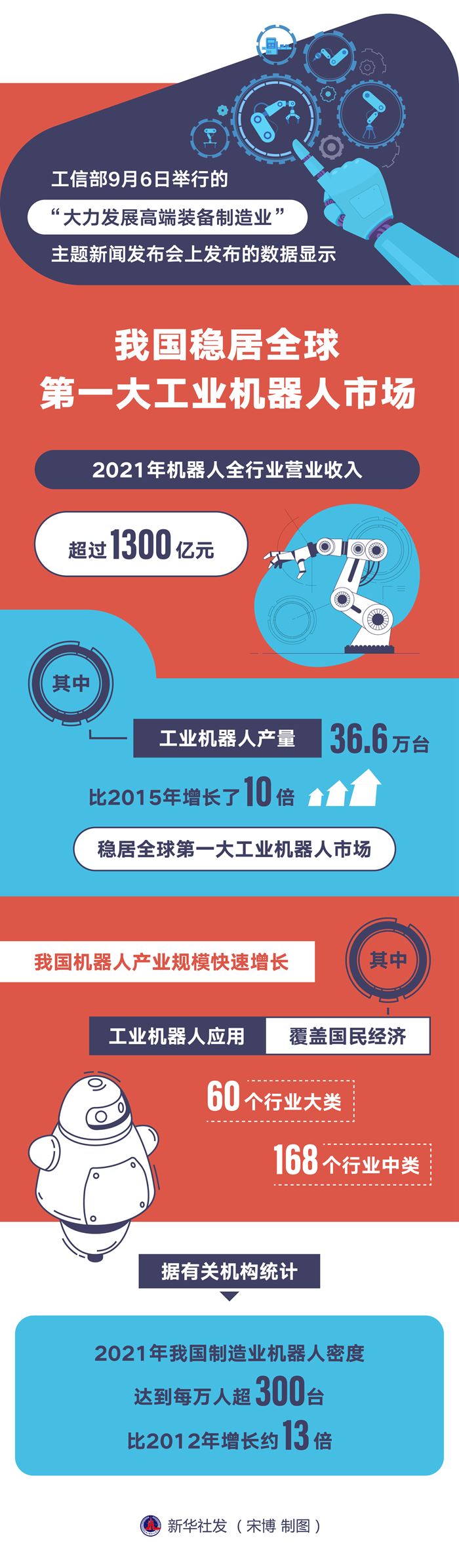 工信部裝備工業(yè)一司副司長郭守剛6日表示,我國機器人產(chǎn)業(yè)規(guī)模快速增長,2021年機器人全行業(yè)營業(yè)收入超過1300億元。其中,工業(yè)機器人產(chǎn)量達36.6萬臺,比2015年增長了10倍,穩(wěn)居全球第一大工業(yè)機器人市場。