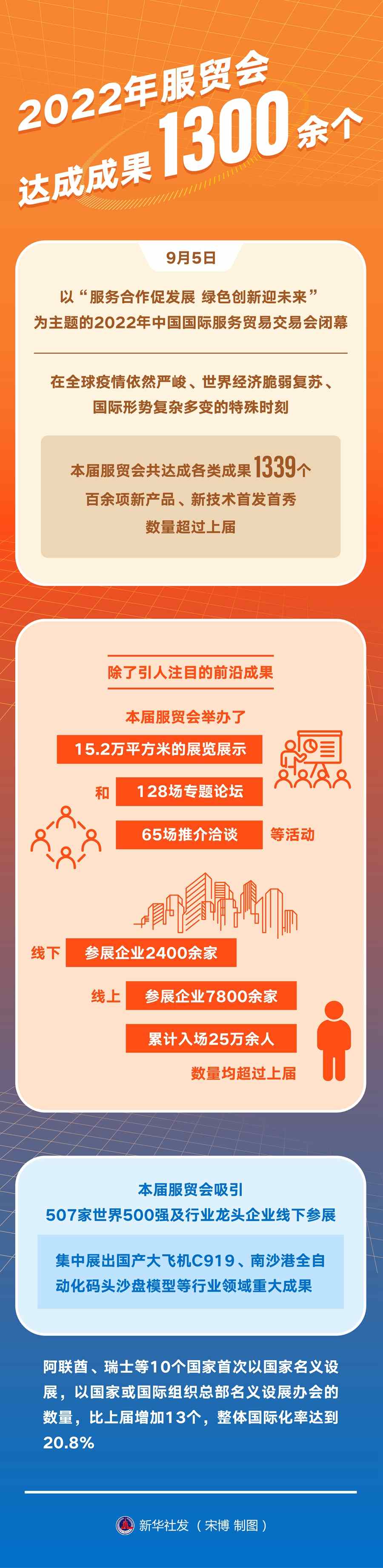 9月5日,以“服務合作促發(fā)展綠色創(chuàng)新迎未來”為主題的2022年中國國際服務貿(mào)易交易會閉幕。在全球疫情依然嚴峻、世界經(jīng)濟脆弱復蘇、國際形勢復雜多變的特殊時刻,本屆服貿(mào)會共達成各類成果1339個,百余項新產(chǎn)品、新技術(shù)首發(fā)首秀,數(shù)量超過上屆。