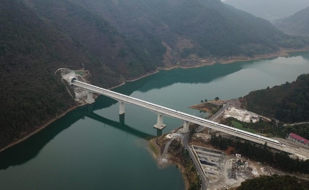 圖為“復興號”列車行駛經(jīng)過杭黃高鐵位于浙江淳安的進賢溪大橋(無人機拍攝)。新華社記者 黃宗治 攝