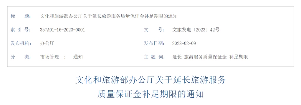 文化和旅游部辦公廳日前發(fā)布通知延長旅游服務(wù)質(zhì)量保證金補(bǔ)足期限。通知提出,按照《文化和旅游部辦公廳關(guān)于進(jìn)一步調(diào)整暫退旅游服務(wù)質(zhì)量保證金相關(guān)政策的通知》(文旅發(fā)電〔2022〕61號)要求享受暫退或暫緩交納保證金政策的旅行社,補(bǔ)足保證金期限延至2024年3月31日。