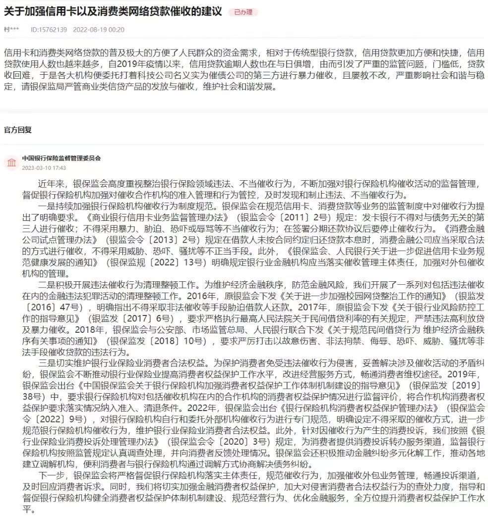 銀保監(jiān)會在回復中表示,近年來,銀保監(jiān)會高度重視整治銀行保險領域違法、不當催收行為,不斷加強對銀行保險機構催收活動的監(jiān)督管理,督促銀行保險機構加強對催收合作機構的準入管理和行為管控,及時發(fā)現和制止違法、不當催收行為。