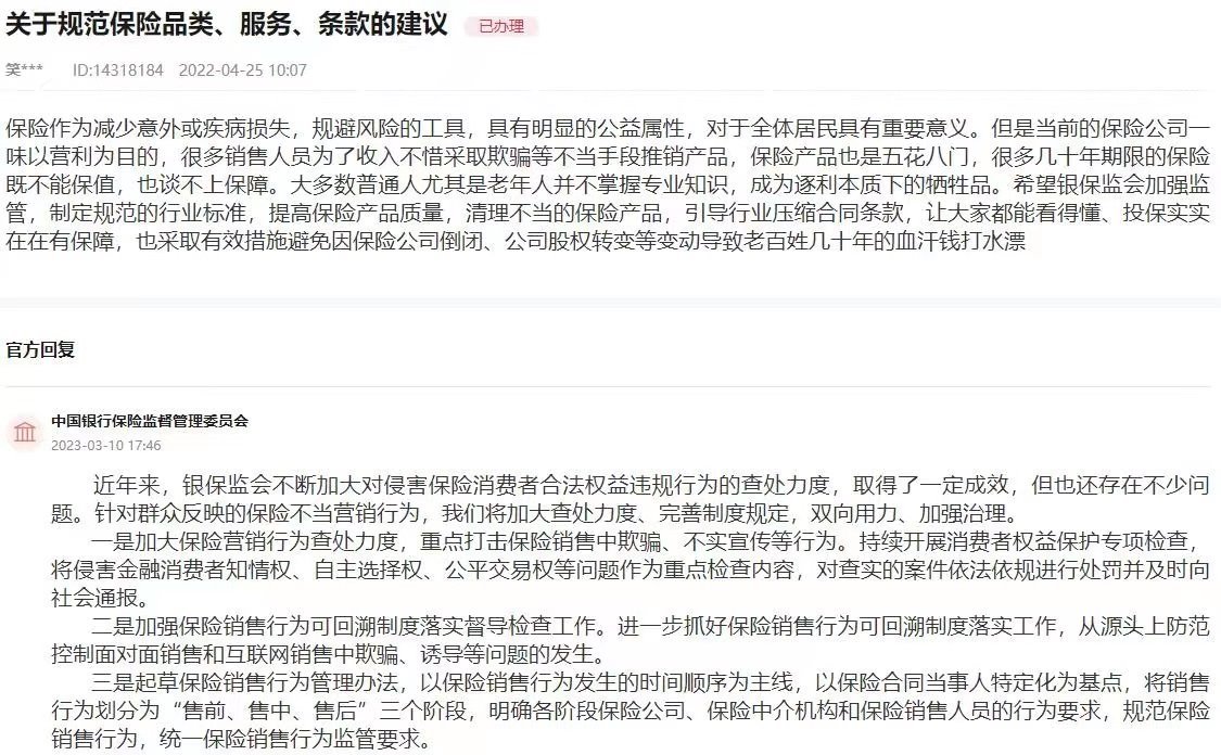 “近年來,銀保監(jiān)會不斷加大對侵害保險消費者合法權益違規(guī)行為的查處力度,取得了一定成效,但也還存在不少問題。”銀保監(jiān)會在回復中表示,針對群眾反映的保險不當營銷行為,將加大查處力度、完善制度規(guī)定,雙向用力、加強治理。