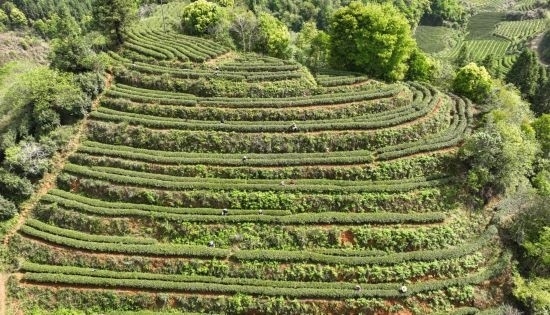 在福建省武夷山市,采茶女工在茶山采茶(無(wú)人機(jī)照片,2023年4月7日攝)。新華社發(fā)(邱汝泉 攝)