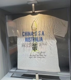 再給大家推薦一個(gè)不容錯(cuò)過的“打卡點(diǎn)”:澳星發(fā)射成功紀(jì)念T恤。這件T恤全部都是著名航天老專家們的“親簽”:林宗棠(時(shí)任航空航天部部長)、劉紀(jì)原(時(shí)任航空航天部副部長)、沈辛蓀(時(shí)任中國運(yùn)載火箭研究院院長)、王德臣(時(shí)任長二E火箭總設(shè)計(jì)師)、屠守鍔(時(shí)任長二E火箭技術(shù)總顧問)等。在紀(jì)念T恤的C位,還有劉竹生院士親筆畫的長征二號(hào)E運(yùn)載火箭(即“長二捆”火箭)的漫畫圖??芍^眾“星”云集,珍貴程度可想而知。