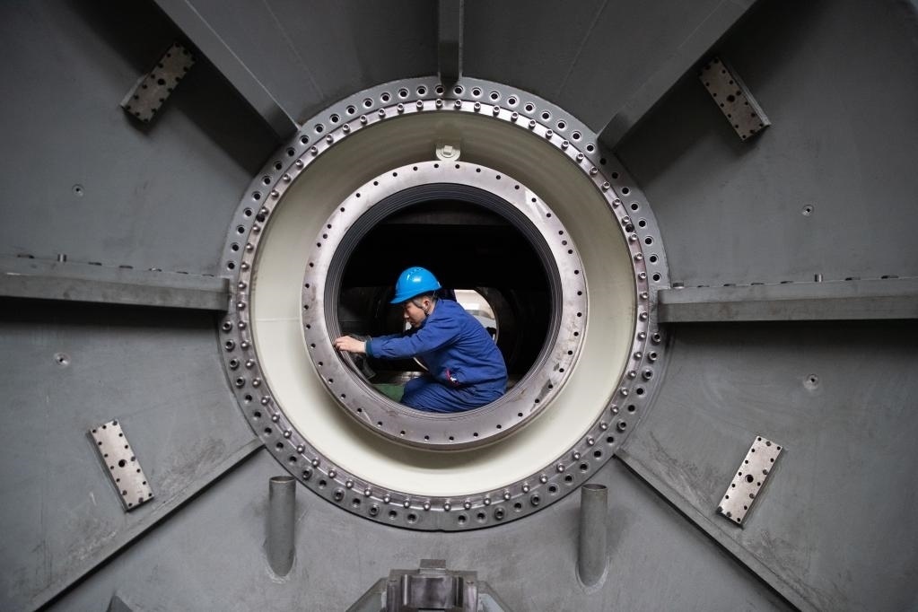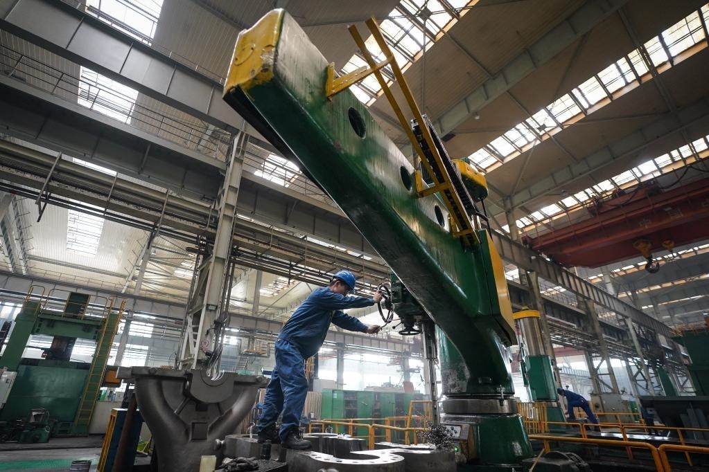 4月28日,工人在哈電集團(tuán)哈爾濱汽輪機(jī)廠有限責(zé)任公司車間內(nèi)生產(chǎn)作業(yè)。新華社記者 張濤 攝