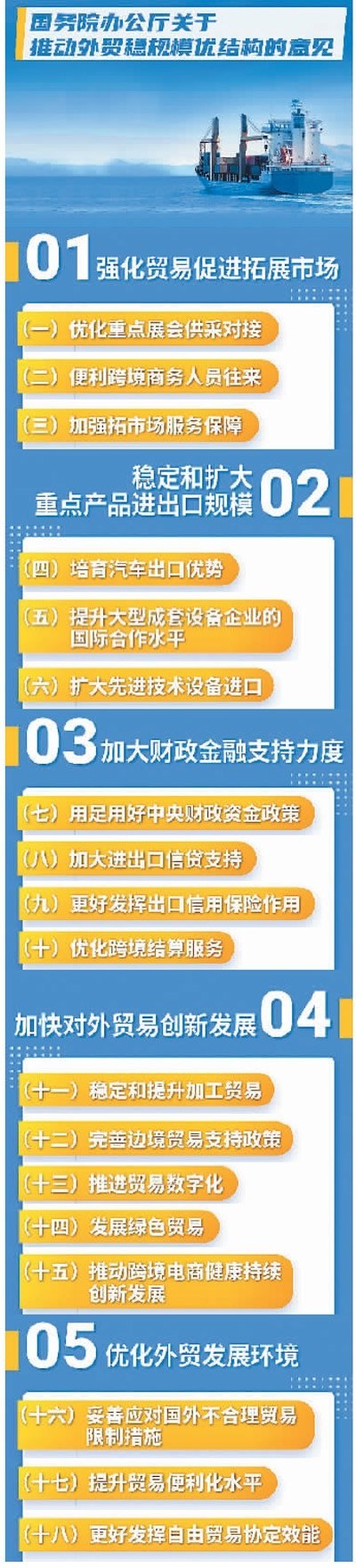 為推動(dòng)外貿(mào)穩(wěn)規(guī)模優(yōu)結(jié)構(gòu),在前期已出臺(tái)多輪政策舉措的基礎(chǔ)上,國(guó)務(wù)院辦公廳4月25日對(duì)外發(fā)布《關(guān)于推動(dòng)外貿(mào)穩(wěn)規(guī)模優(yōu)結(jié)構(gòu)的意見(jiàn)》(以下簡(jiǎn)稱《意見(jiàn)》),推出新一輪措施。專家認(rèn)為,此次提出的18條具體措施既涉及重點(diǎn)產(chǎn)品,也關(guān)乎市場(chǎng)拓展和貿(mào)易創(chuàng)新,具有很強(qiáng)的針對(duì)性和操作性,有助于穩(wěn)住外貿(mào)規(guī)模,并在此基礎(chǔ)上進(jìn)一步優(yōu)化外貿(mào)結(jié)構(gòu),推動(dòng)實(shí)現(xiàn)全年進(jìn)出口促穩(wěn)提質(zhì)目標(biāo)任務(wù)。