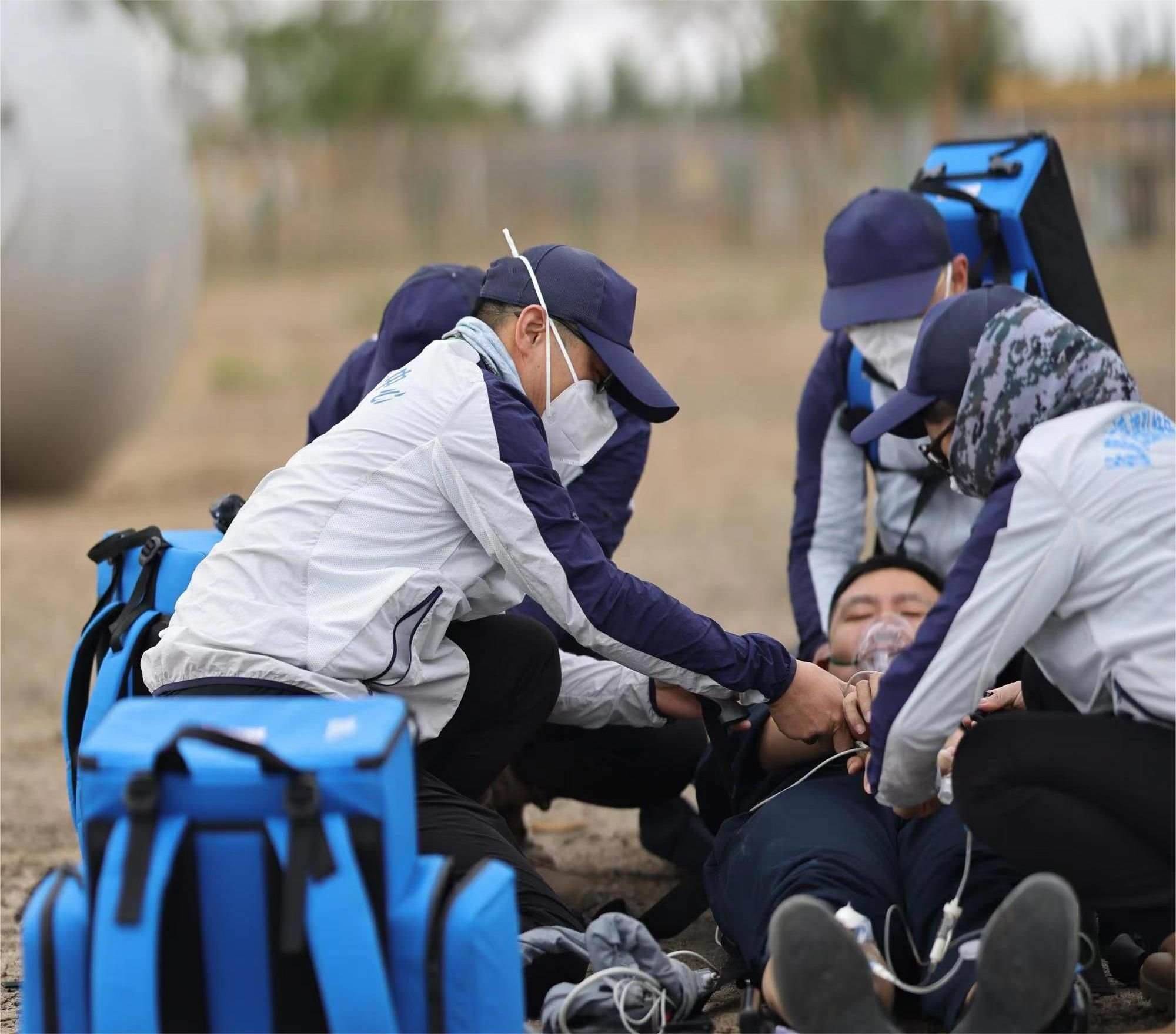 醫(yī)學(xué)急救“白金10分鐘、黃金1小時”,針對可能出現(xiàn)的飛船返回偏離落點(diǎn),落在沙漠、山地、湖泊,搜救直升機(jī)無法降落,車輛無法進(jìn)入的情況,為快速到達(dá)著陸地點(diǎn),醫(yī)療救護(hù)隊員每天隨身攜帶艙前急救設(shè)備堅持訓(xùn)練六七個小時,負(fù)重在沙漠、山地中奔跑,爭取最短時間展開緊急救治。夏日戈壁驕陽似火,風(fēng)沙彌漫,訓(xùn)練一天下來,隊員們耳朵眼里都是沙土,臉上脖子全是泥印,一個個都成了泥人。茫茫大草原記錄了神舟載人飛行任務(wù)醫(yī)療隊員們一次次醫(yī)療救護(hù)空地協(xié)同演練、全域協(xié)同演練的身影……