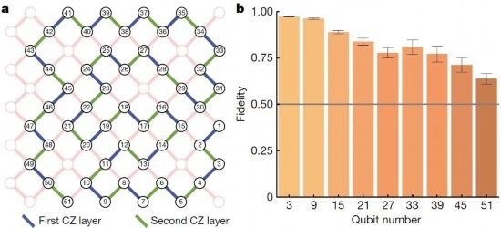 利用“祖沖之二號”完成的51比特一維簇態(tài)制備的線路及量子態(tài)保真度結(jié)果。(研究團(tuán)隊供圖)