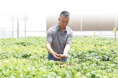定西馬鈴薯研究所負責人李進福在查看馬鈴薯原原種長勢。本報記者 王錦濤攝