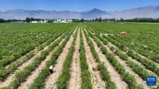 6月12日,采摘工在枸杞地里采摘枸杞(無(wú)人機(jī)照片)。