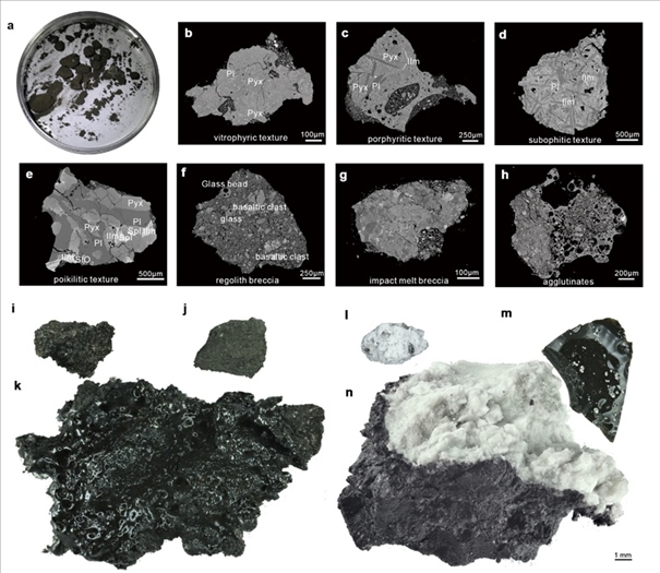 研究發(fā)現(xiàn),嫦娥六號采集的巖屑碎片主要由玄武巖、角礫巖、粘結(jié)巖、淺色巖石和玻璃質(zhì)物質(zhì)組成。其中,玄武巖碎片占總量的30%至40%,角礫巖和粘結(jié)巖由玄武巖碎屑、玻璃珠、玻璃碎片以及少量的斜長巖和蘇長巖等淺色巖石碎屑物質(zhì)構(gòu)成,進一步揭示了樣品來源的復(fù)雜性。