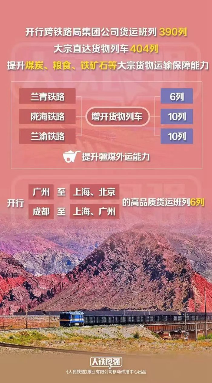 貨運(yùn)方面,鐵路部門統(tǒng)籌運(yùn)用線路、場(chǎng)站資源,安排開行跨鐵路局集團(tuán)公司貨運(yùn)班列390列,大宗直達(dá)貨物列車404列,提升煤炭、糧食、鐵礦石等大宗貨物運(yùn)輸保障能力,為冬季能源保供和國民經(jīng)濟(jì)平穩(wěn)運(yùn)行提供有力支撐。其中,優(yōu)化調(diào)整蘭州鐵路樞紐列車運(yùn)行方案,蘭青、隴海、蘭渝鐵路分別增開貨物列車6列、10列、10列,提升疆煤外運(yùn)能力。適應(yīng)貨運(yùn)市場(chǎng)需求,優(yōu)化貨運(yùn)班列產(chǎn)品供給,開行廣州至上海、北京,成都至上海、廣州的高品質(zhì)貨運(yùn)班列6列,串聯(lián)京津冀、長三角、粵港澳大灣區(qū)、成渝地區(qū)等主要經(jīng)濟(jì)區(qū)域,打造快捷物流產(chǎn)品示范線。