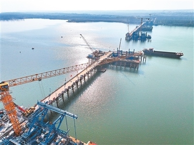 江西省南昌市南昌縣昌南大橋項(xiàng)目施工現(xiàn)場(chǎng),工人在加緊推進(jìn)橋梁承臺(tái)和引橋建設(shè)。