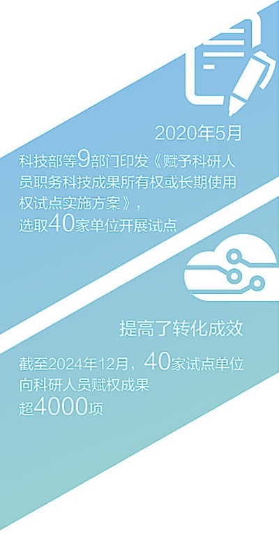 賦權(quán)試點(diǎn)實(shí)施以來,40家試點(diǎn)單位向科研人員賦權(quán)成果超4000項(xiàng)。2023年,以轉(zhuǎn)讓、許可、作價(jià)投資三種方式轉(zhuǎn)化科技成果合同金額達(dá)36.25億元,參與試點(diǎn)的科研人員普遍可獲科技成果轉(zhuǎn)化收益70%以上。僅2023年,試點(diǎn)單位對科研人員的現(xiàn)金股權(quán)獎(jiǎng)勵(lì)就高達(dá)9.33億元。