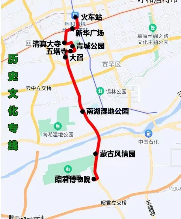 歷史文化專線(火車站——昭君博物院)途經(jīng):錫林北路、新華大街、通道南路、中山西路、石羊橋路、大東街、大北街、大南街、昭君路。沿途設(shè)站:火車站、新華廣場(chǎng)、清真大寺、青城公園、五塔寺、大召、南湖濕地公園、蒙古風(fēng)情園、昭君博物院,單程:17.2公里,配車:8臺(tái)。