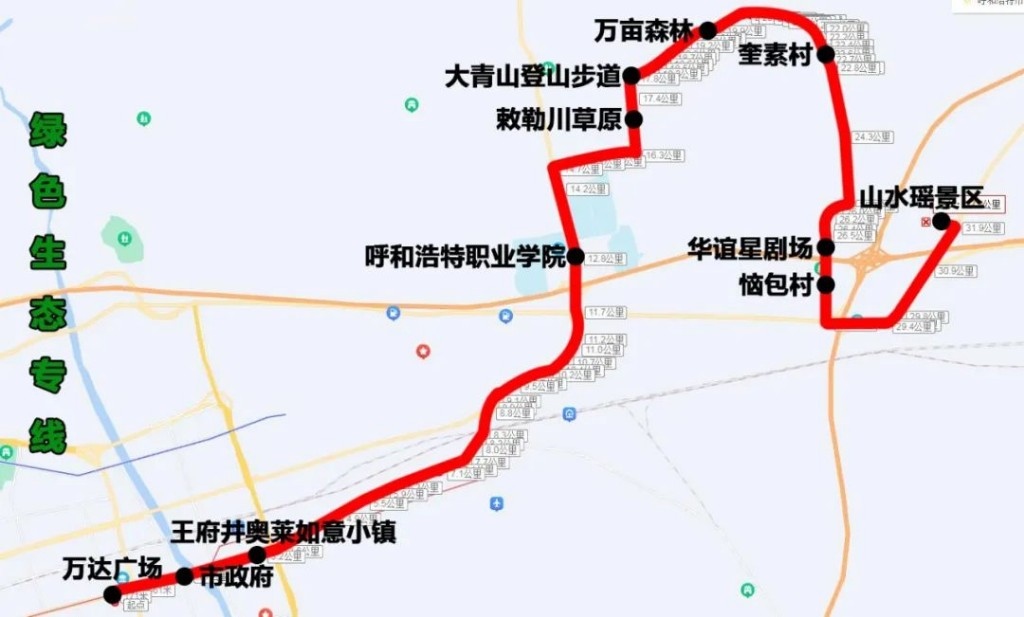 綠色生態(tài)專線(萬(wàn)達(dá)廣場(chǎng)——山水瑤景區(qū))途經(jīng):新華東街、機(jī)場(chǎng)路、S101、呼和塔拉東街、野馬圖路、Y371、惱包路、110國(guó)道、S105省道。沿途設(shè)站:萬(wàn)達(dá)廣場(chǎng)、市政府、王府井奧萊如意小鎮(zhèn)、呼和浩特職業(yè)學(xué)院、敕勒川草原、大青山登山步道、萬(wàn)畝森林、奎素村、華誼星劇場(chǎng)、惱包村、山水謠景區(qū),單程:33公里,配車:8—10臺(tái)。