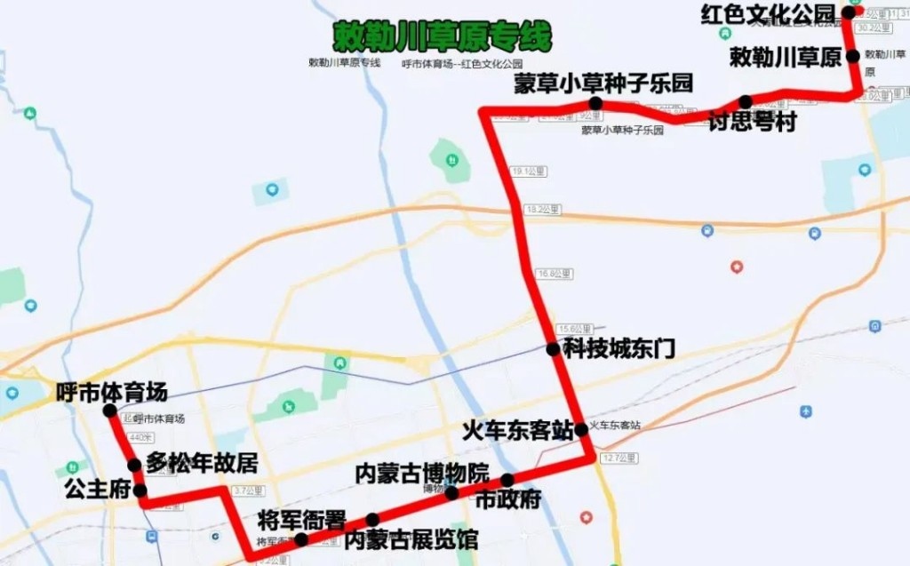 敕勒川草原專線(呼市體育場(chǎng)——紅色文化公園)途經(jīng):氣象局西巷、海拉爾西街、呼倫南路、新華大街、新華東街、科爾沁北路輔道、呼和塔拉西街、呼和塔拉東街、野馬圖、Y371。沿途設(shè)站:呼市體育場(chǎng)、多松年故居、公主府、將軍衙署、內(nèi)蒙古展覽館、內(nèi)蒙古博物院、市政府、火車東客站、科技城東門、蒙草小草種子樂(lè)園、討思號(hào)村、敕勒川草原、紅色文化公園,單程:30.5公里,配車:8—10臺(tái)。