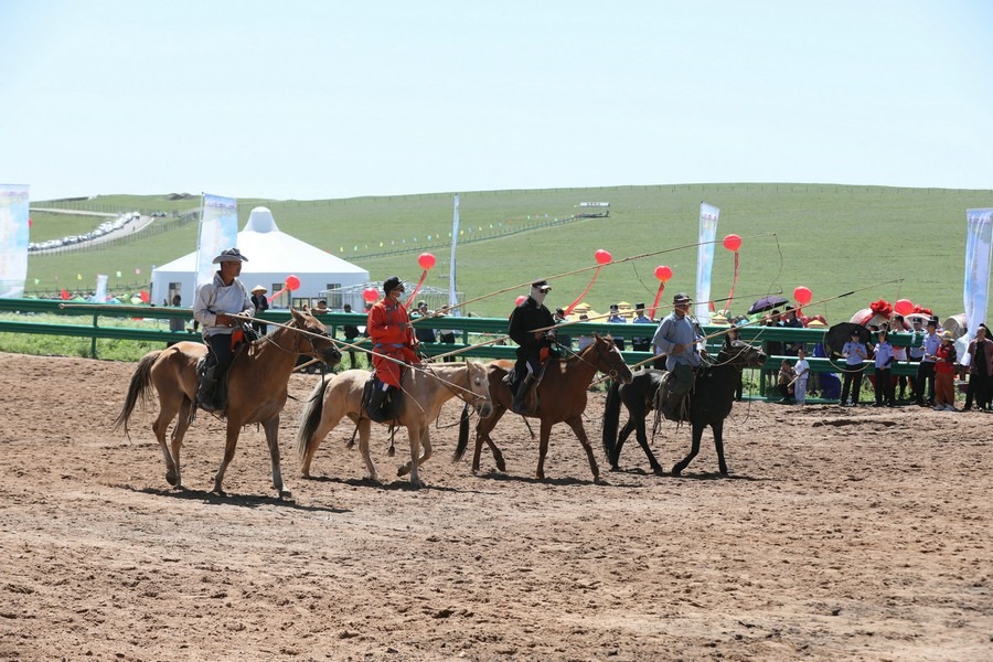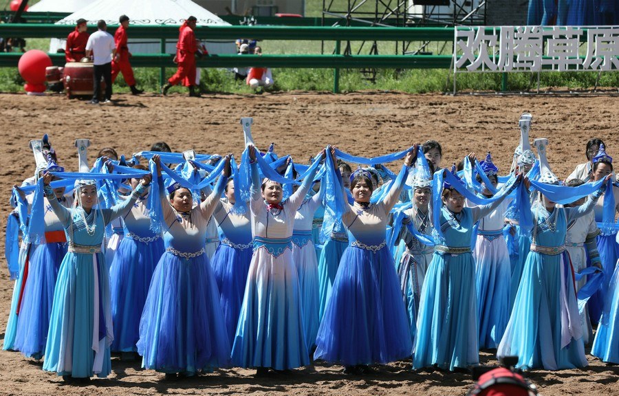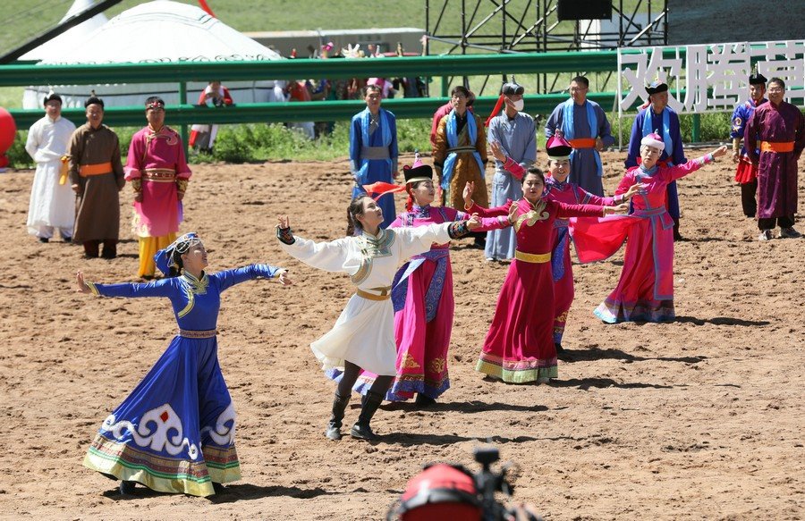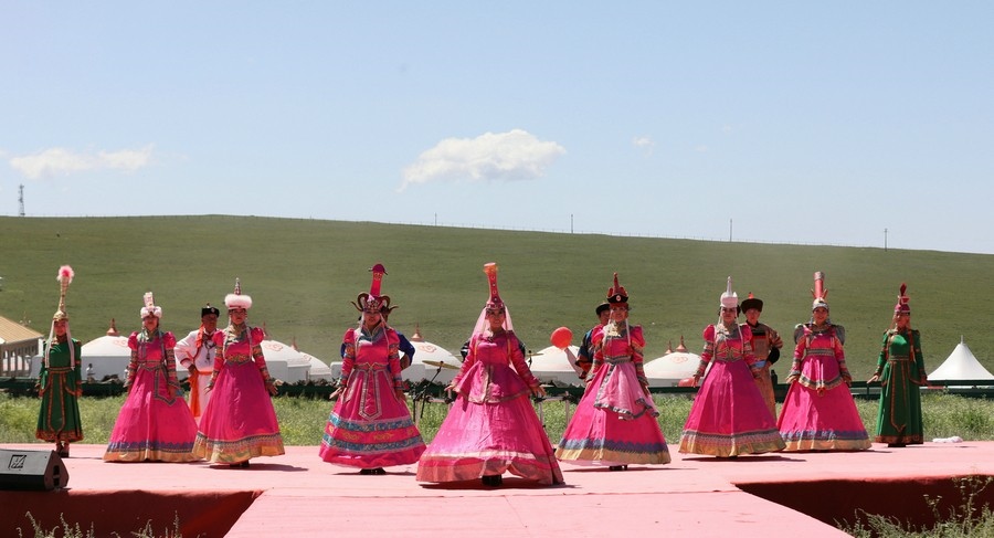伴著悠揚的歌聲,踏著激昂的步伐,在旗幟方隊的引領(lǐng)下,哈達方隊、民族方隊、烏蘭牧騎方隊、牧馬人方隊、裁判員及運動員方隊依次走進會場。隨著彩煙燃放,氣球升空,那達慕在梅林組合的歌曲《歡騰那達慕》中拉開帷幕。隨后,歌伴舞《石榴花開》等節(jié)目輪番登場,現(xiàn)場觀眾掌聲雷動,讓來自全國各地的游客在紅石崖高山牧場領(lǐng)略了草原的柔情。