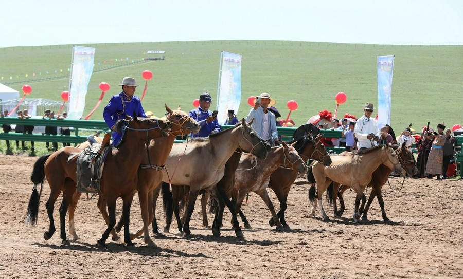 文藝演出結(jié)束后,進行了傳統(tǒng)的那達慕賽事項目。賽馬場上群馬奔騰、塵土飛揚,場面蔚為壯觀,騎手們揚鞭策馬,展現(xiàn)出精湛的騎術(shù),贏得觀眾陣陣歡呼。摔跤場上,搏克手你來我往互不相讓,斗智斗勇……