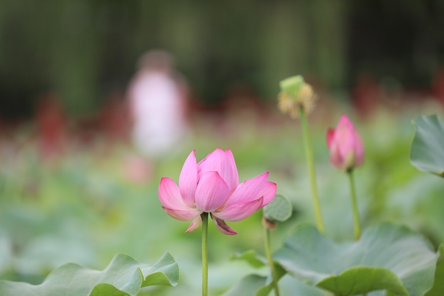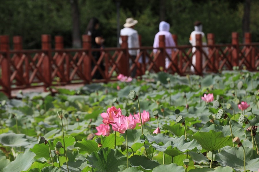 初秋時(shí)節(jié),水光瀲滟間,公園內(nèi)的滿(mǎn)池荷花嬌艷、荷葉青翠,漫步棧道中,仿佛置身于一幅詩(shī)意的畫(huà)卷。