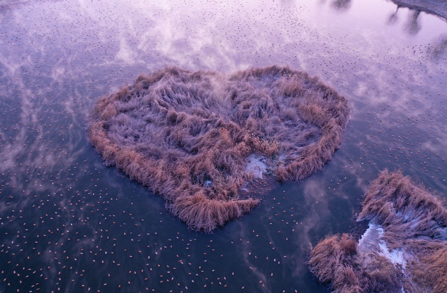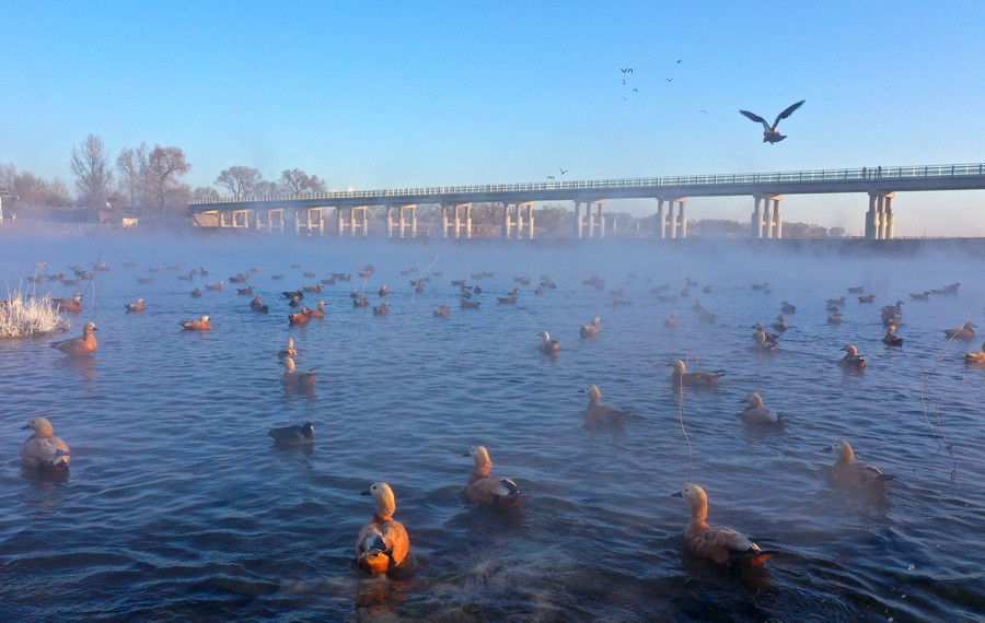 12月15日,上萬只赤麻鴨在塞外“千島湖”棲息游弋