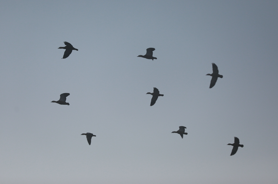 12月15日清晨,塞外“千島湖”畔幾只赤麻鴨從空中掠過