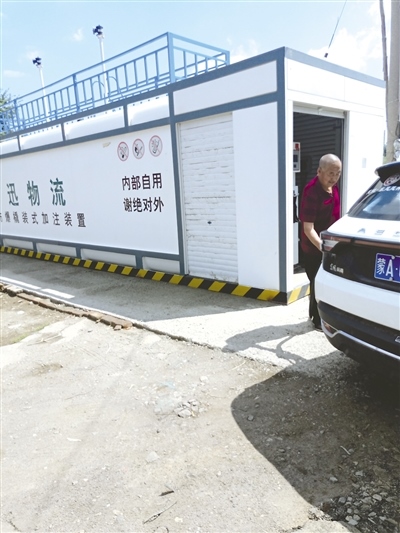 6月29日16時許,記者來到回民區(qū)塞外安康新居小區(qū)。該小區(qū)旁邊是一處老舊廠區(qū)。記者開車進(jìn)入這個老舊廠區(qū)看到,在大門的左手邊有一臺撬裝式加注裝置。這時,一名中年婦女告訴記者,加油往里走,這臺裝置壞了。隨后,記者開車又往廠區(qū)院里走了約50米,在路的右側(cè)有一臺撬裝式加注裝置,這臺裝置距離塞外安康新居小區(qū)的居民樓很近(如圖二)。記者把車停在加注裝置旁邊,一位老人熟練地打開車的油箱蓋,問記者加多少錢的油。加油過程中,老人告訴記者,“這個撬裝式加注裝置是向安監(jiān)部門申請的,供單位內(nèi)部用油。”記者詢問:“既然是供單位內(nèi)部使用,那對外加油不怕被查?”老人說:“執(zhí)法部門查不查,那是老板的事兒。因為油便宜,來這里加油的人不少?!边@里92號汽油每升為4.3元。