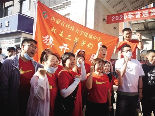 紅彤彤的T恤搭配醒目的金色“對鉤”,在校門前,十幾名“對鉤T恤”排成一排,為步入考場的學生們送去祝福。身穿T恤的是內(nèi)科大附中畢業(yè)班的老師們。據(jù)介紹,當天除了監(jiān)考老師外,內(nèi)科大附中畢業(yè)班的其他老師都穿著寓意“旗開得勝”的T恤,自發(fā)組成三隊,分別前往考生所在的三個考場送考。