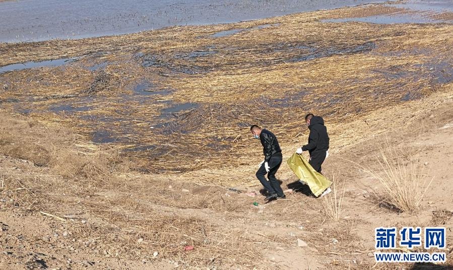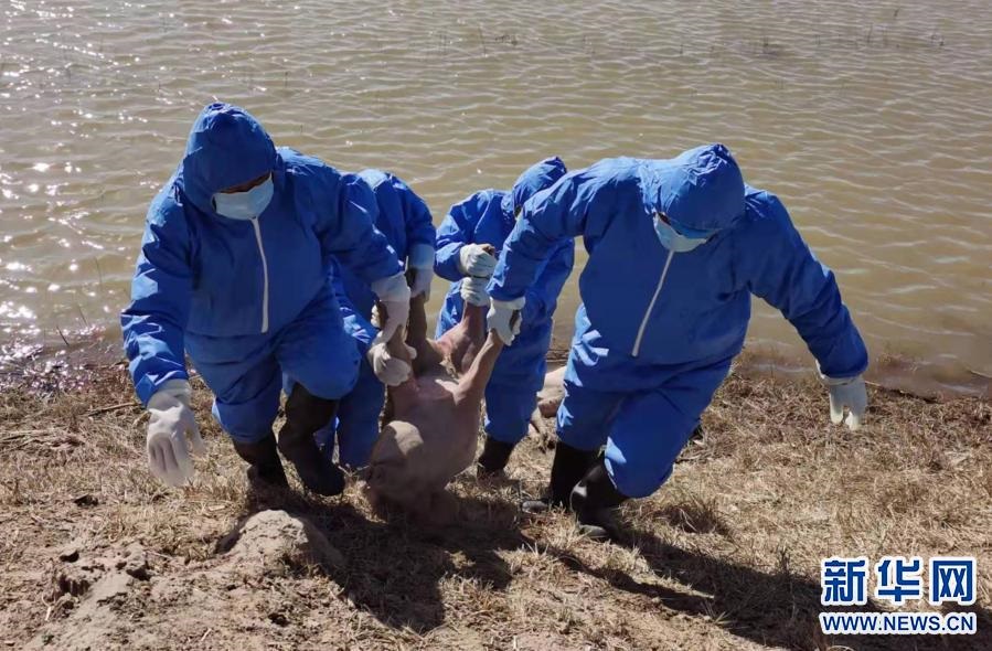3月21日,當(dāng)?shù)卣块T(mén)派出的工作人員在達(dá)拉特旗黃河國(guó)堤內(nèi)收集死畜。新華社發(fā)