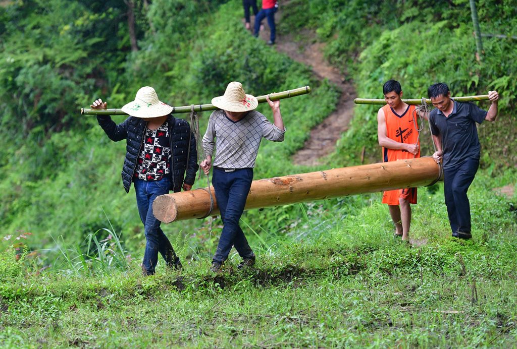 在黔桂烏英苗寨,群眾在抬木頭,準備建新木樓(2019年6月1日攝)。