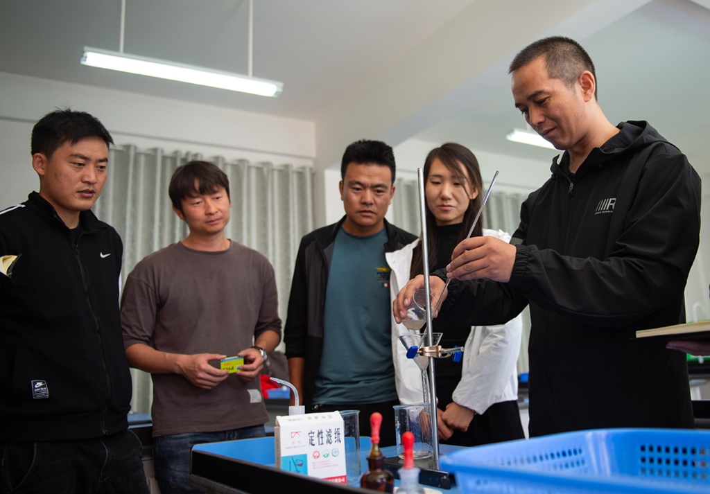 北京市援青支教教師、來自通州區(qū)陸辛莊學校的化學教師祁生貴(右一)在青海省玉樹州第四民族高級中學指導學校教師進行實驗教學(2020年8月12日攝)。新華社記者 陳鐘昊 攝