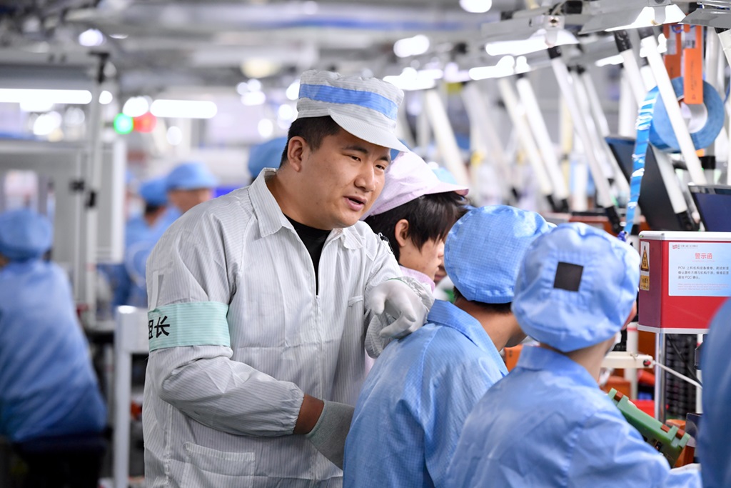 寧夏青年陳滿庫在飛毛腿(福建)電子有限公司車間指導工人操作(2021年2月3日攝)。