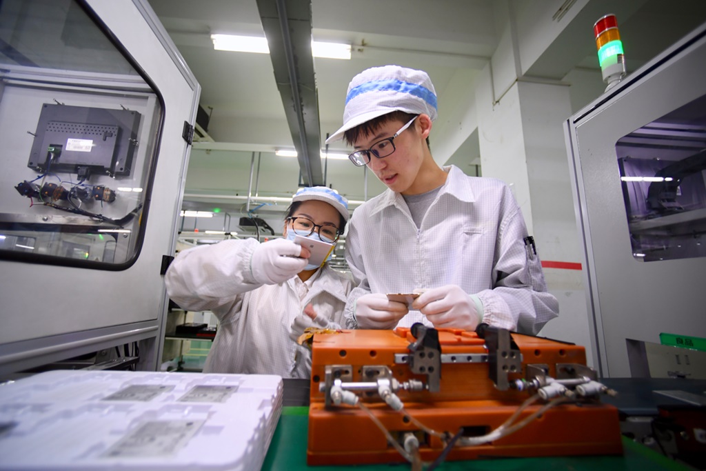 福建省飛毛腿高級技工學校三年級寧夏籍學生海鵬(右)在飛毛腿(福建)電子有限公司車間實習(2021年3月4日攝)。