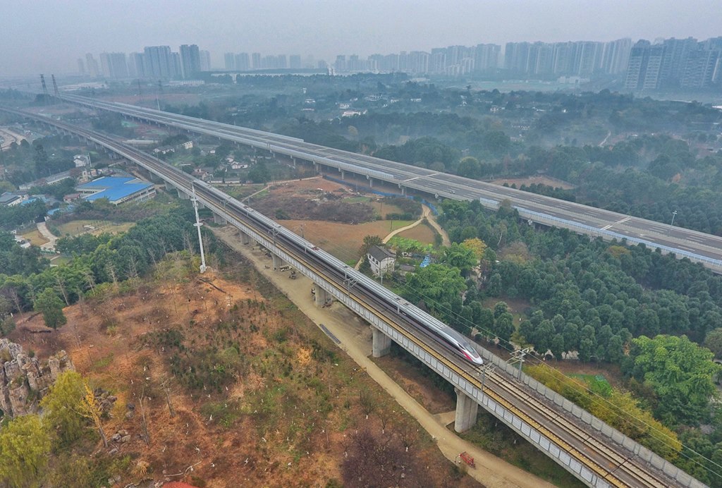 2020年12月24日,“復興號CR400AF動車組”首次在成渝地區(qū)投入運營,自此兩地間的高鐵通達時間縮短至62分鐘,實現(xiàn)成渝間高鐵公交化運營1小時通達。成渝高鐵是我國“八縱八橫”高鐵主通道沿江通道的重要組成部分,是成渝地區(qū)雙城經(jīng)濟圈城際鐵路網(wǎng)的主骨架。新華社記者 劉坤 攝