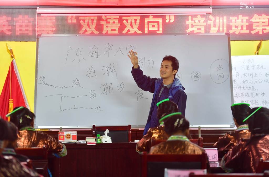 在廣西融水苗族自治縣桿洞鄉(xiāng)黨鳩村烏英苗寨,廣東海洋大學教授陳濤在給夜校班的婦女們上課(2020年10月16日攝)。新華社記者 黃孝邦 攝