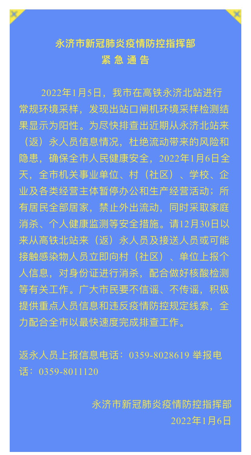 2022年1月5日,山西省永濟(jì)市在高鐵永濟(jì)北站進(jìn)行常規(guī)環(huán)境采樣,發(fā)現(xiàn)出站口閘機(jī)環(huán)境采樣檢測結(jié)果顯示為陽性。為盡快排查出近期從永濟(jì)北站來(返)永人員信息情況,杜絕流動帶來的風(fēng)險和隱患,確保全市人民健康安全,1月6日全天,全市機(jī)關(guān)事業(yè)單位、村(社區(qū))、學(xué)校、企業(yè)及各類經(jīng)營主體暫停辦公和生產(chǎn)經(jīng)營活動;所有居民全部居家,禁止外出流動,同時采取家庭消殺、個人健康監(jiān)測等安全措施。請12月30日以來從高鐵北站來(返)永人員及接送人員或可能接觸感染物人員立即向村(社區(qū))、單位上報(bào)個人信息,對身份證進(jìn)行消殺,配合做好核酸檢測等有關(guān)工作。廣大市民要不信謠、不傳謠,積極提供重點(diǎn)人員信息和違反疫情防控規(guī)定線索,全力配合全市以最快速度完成排查工作。