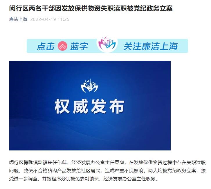 閔行區(qū)梅隴鎮(zhèn)副鎮(zhèn)長(zhǎng)任偉萍、經(jīng)濟(jì)發(fā)展辦公室主任栗爽,在發(fā)放保供物資過(guò)程中存在失職瀆職問(wèn)題,致使不合格豬肉產(chǎn)品發(fā)放給社區(qū)居民,造成嚴(yán)重不良影響。兩人均被黨紀(jì)政務(wù)立案,接受進(jìn)一步調(diào)查,并按程序分別被免去副鎮(zhèn)長(zhǎng)、經(jīng)濟(jì)發(fā)展辦公室主任職務(wù)。