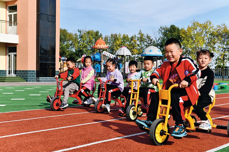在山東省東營市墾利區(qū)楊廟社區(qū)幼兒園,孩子們在老師的帶領下進行戶外活動(2021年10月19日攝) 郭緒雷攝