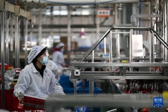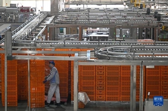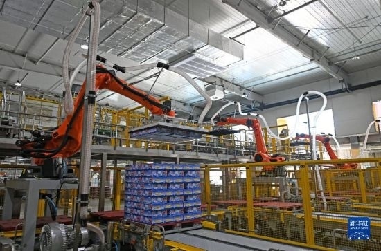 在天津海河乳品有限公司智能化生產(chǎn)線,智能生產(chǎn)設(shè)備在轉(zhuǎn)運貨物(2月20日攝)。