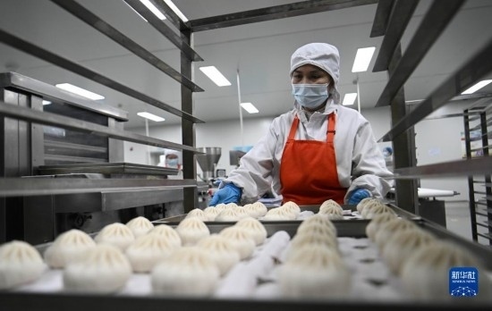 天津利達糧油有限公司速凍面食生產(chǎn)車間,工作人員在搬運速凍包子(2月23日攝)。