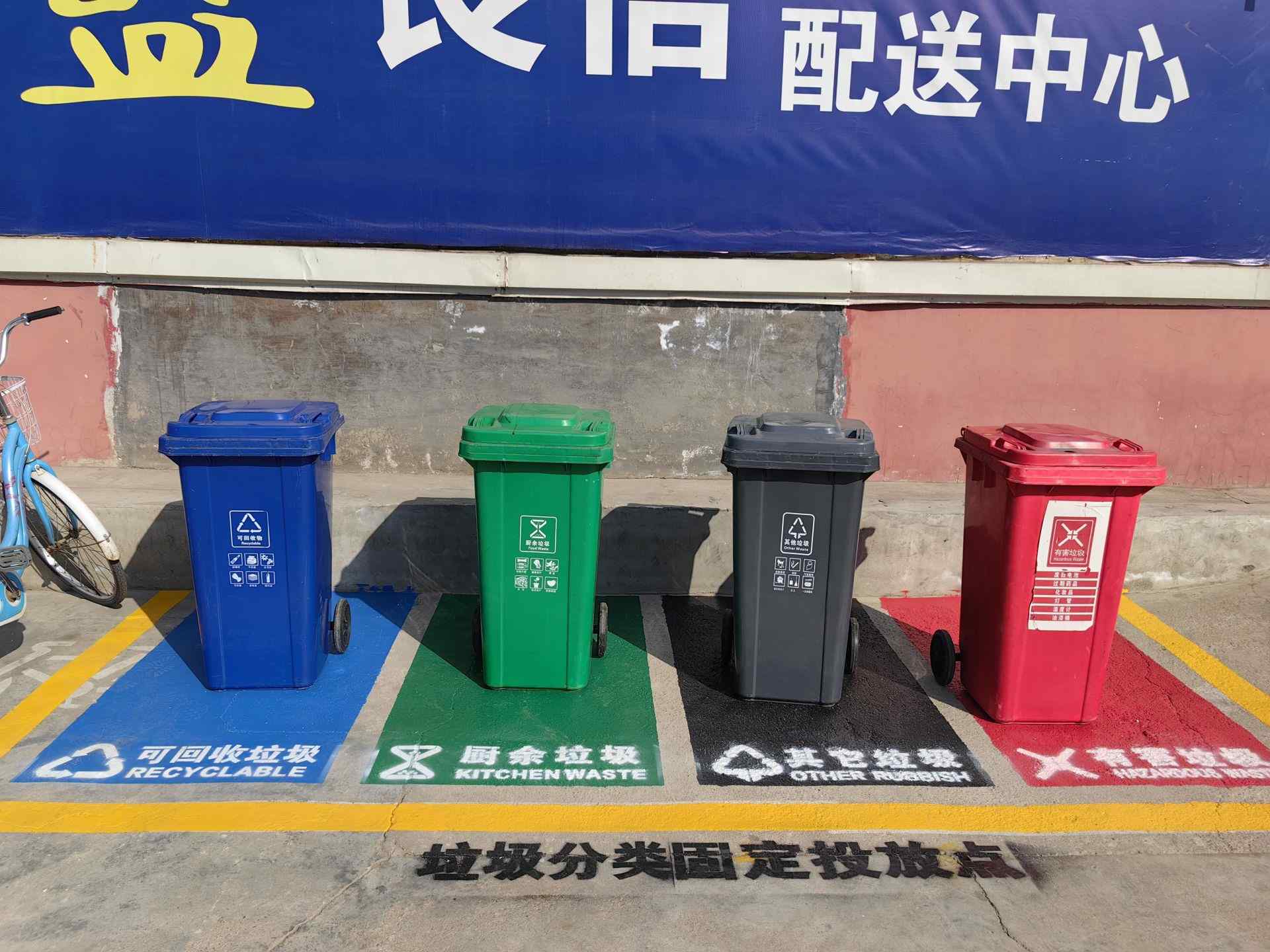 當(dāng)日下午,記者來(lái)到農(nóng)貿(mào)市場(chǎng)西門,只見紅、綠、藍(lán)、黑四種分類垃圾桶整齊陳列,地面上畫了對(duì)應(yīng)顏色的標(biāo)識(shí)和投放垃圾類別的文字簡(jiǎn)介,“垃圾分類固定投放點(diǎn)”幾個(gè)大字非常顯眼。像這樣的“地標(biāo)”市場(chǎng)里不止一處,在農(nóng)貿(mào)市場(chǎng)北門,工人們正在給“垃圾分類投放地標(biāo)”噴漆,南門西側(cè)的“地標(biāo)”也完成了基礎(chǔ)設(shè)置。此舉旨在完善分類垃圾桶宣傳告知功能,讓更多人清晰了解分類垃圾桶的具體功能,防止垃圾混投,實(shí)現(xiàn)精準(zhǔn)投放。