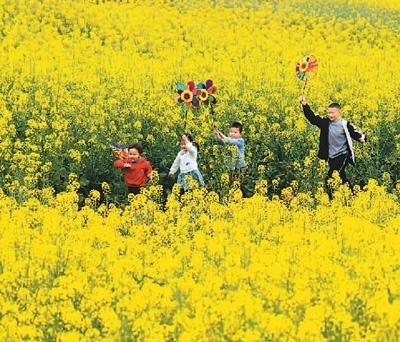 2022年,四川省眉山市仁壽縣謝安鎮(zhèn)扎林村對(duì)1200畝撂荒地集中整治,通過集體經(jīng)濟(jì)聯(lián)合社進(jìn)行統(tǒng)一種植、統(tǒng)一管理,既盤活了閑置土地、讓村民變股民,又讓荒山成景點(diǎn)。圖為3月5日,兒童在扎林村油菜花地里玩耍。 潘 帥攝(人民視覺)