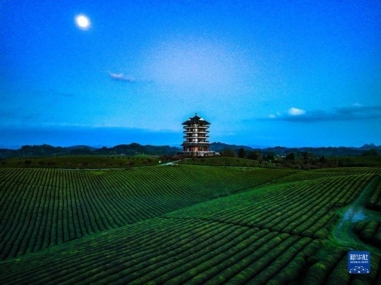 4月4日在遵義市湄潭縣永興鎮(zhèn)拍攝的月光下的“萬(wàn)畝茶海”(無(wú)人機(jī)照片)。