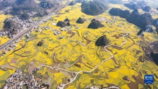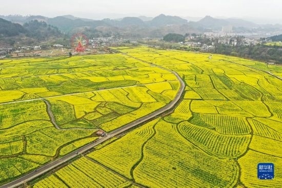 這是3月12日拍攝的貴州省貴定縣盤(pán)江鎮(zhèn)“金海雪山”景區(qū)油菜花海(無(wú)人機(jī)照片)。